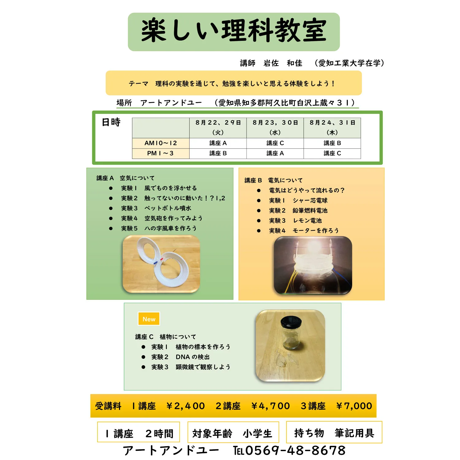 ■6.楽しい理科教室 科学実験を交えながら楽しく理科の勉強をします。 講座A「空気について」 講座B「電気について」 講座C「植物について」 講師:岩佐 和佳 受講料:小学生以上 1講座¥2,400 / 2講座まとめて¥4,700/ 3講座まとめて¥7,000 持ち物:筆記用具 |