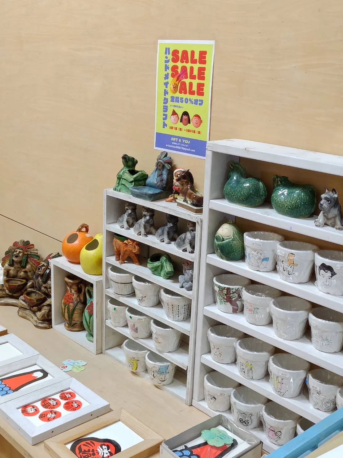 【SALEのお知らせ】ハンドメイドクラフト SALE 3/31まで By shindou 2026年3月12日2026年3月12日 ハンドメイドクラフト SALE ハンドメイド作品を 期間限定で全品50%OFF! 陶芸作品やクラフト小物など、 手作りのあたたかみのある作品を お求めやすい価格で販売しています。 ぜひこの機会にお立ち寄りください。 📅 3月1日〜3月31日まで ※一部対象外あり ※岩崎先生のポストカードは割引対象外です。 セール会場の様子 この記事をSNSでシェア!